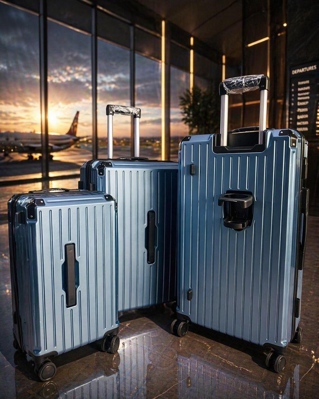 - Style : Look moderne et premium, mis en valeur ici dans un terminal d’aéroport au coucher du soleil. Le design rigide en polycarbonate ou ABS donne une impression de solidité et de légèreté.