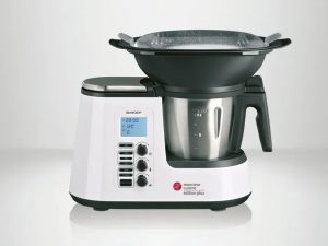 Design & prise en main Ce robot multifonction arbore un look épuré en blanc laqué avec des finitions inox. Compact mais robuste, il trouve facilement sa place sur un plan de travail. L’écran LCD rétroéclairé affiche le temps, la température et la vitesse, et les boutons + molettes donnent un accès rapide à tous les réglages. Ce qu’on voit sur la photo Bol principal en inox avec une capacité d’environ 2,2 L, gradué jusqu’à 2 L max. C’est là que tout se passe : mixer, pétrir, cuire, émulsionner. Panier vapeur Varoma noir posé au-dessus avec son couvercle transparent. Parfait pour cuire légumes, poissons ou semoule à la vapeur pendant que le bol prépare une sauce. Base moteur qui intègre la balance, le chauffage par induction et le bloc de commande.Fonctions clés 10 en 1 : il pèse, mixe, hache, émince, pétrit, cuit à la vapeur, mijote, saisit, émulsionne et fait bouillir.